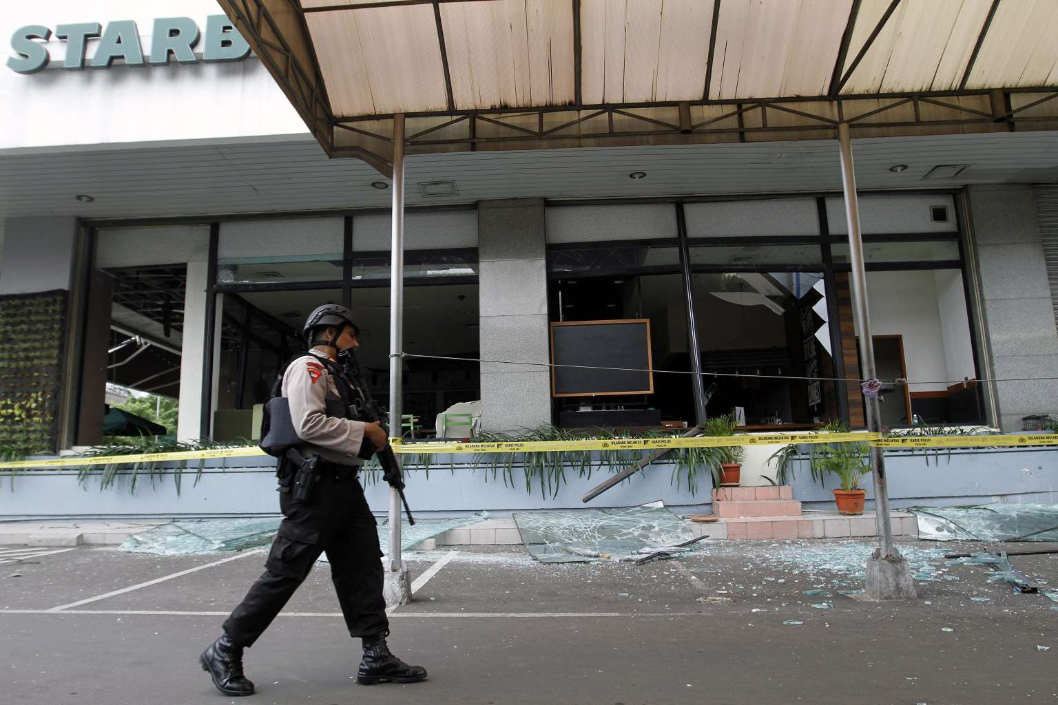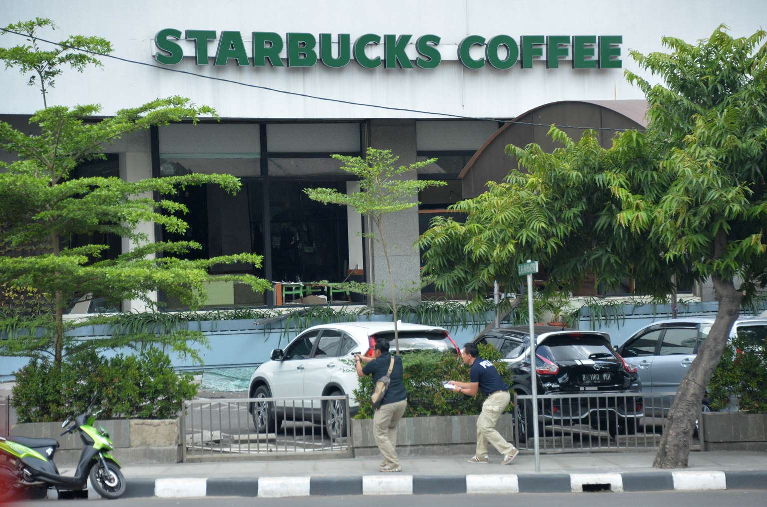 10.50 - 10.55am: Indonesian police securing the area in front of the damaged Starbucks cafe.