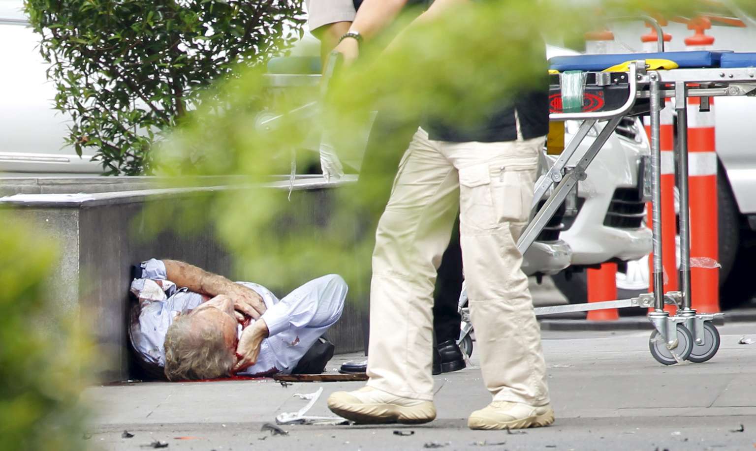 11am: A wounded foreign national lies surrounded by security and emergency workers following the attack in Jakarta on Jan 14, 2016.