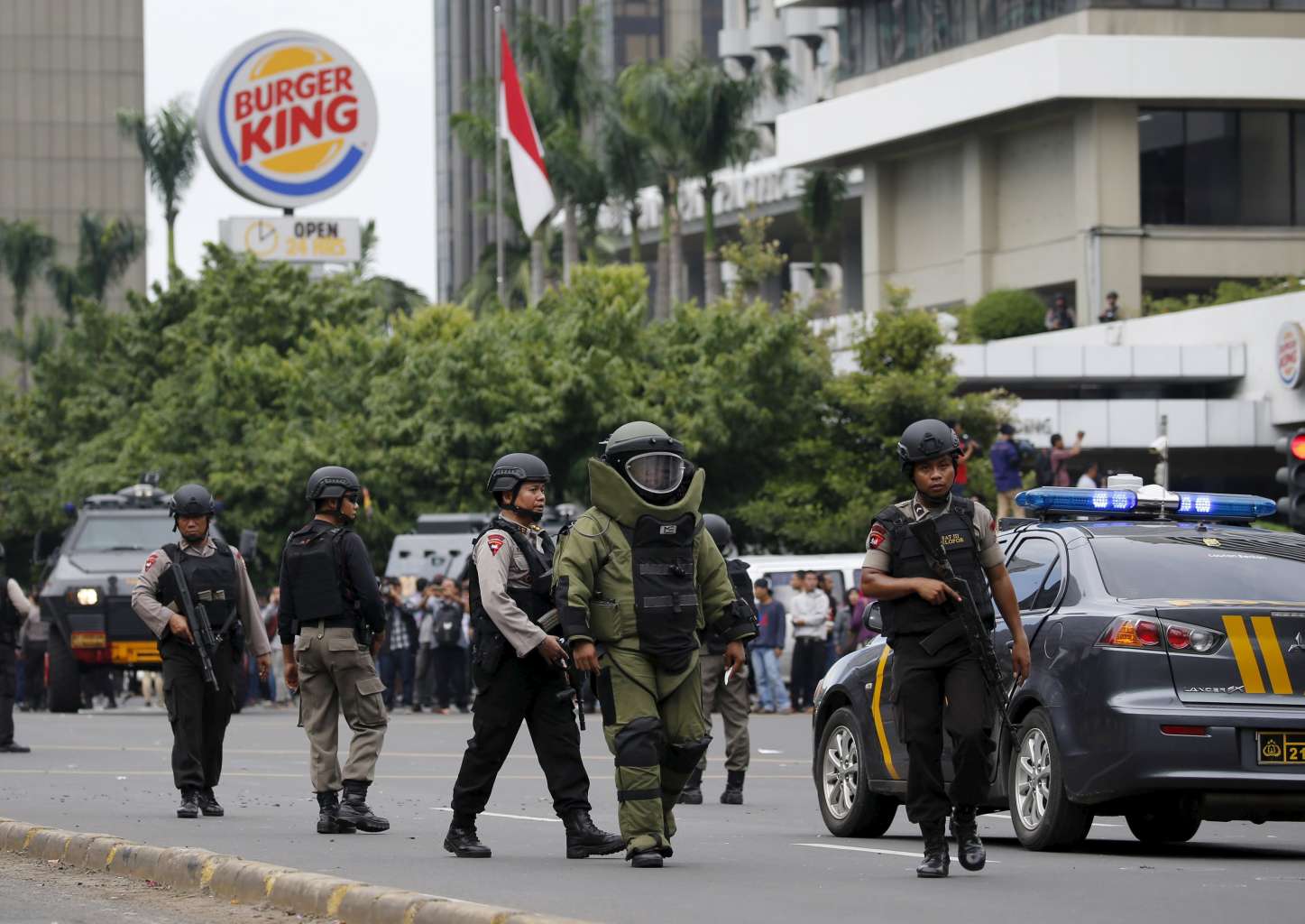11am: Indonesian police bomb squad members walking to the site of a bomb blast in Jakarta.