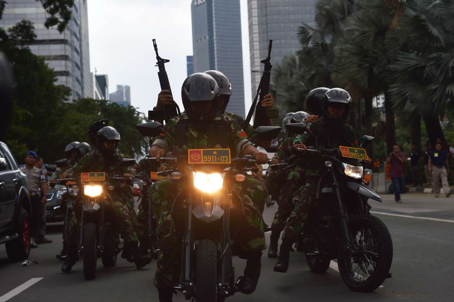 11.20am: Indonesian armed military personnel patrolling the area near a cafe after a series of blasts hit Jakarta on Jan 14, 2016.