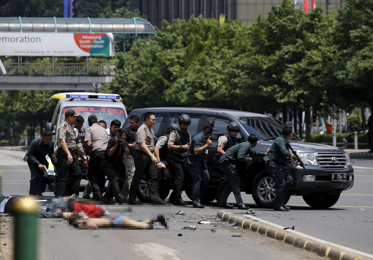 11am: Bodies are seen as Indonesian police hold rifles while walking behind a car for protection in Jakarta on Jan 14, 2016.