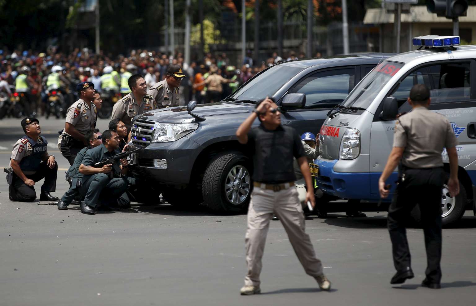 10.50 - 10.55am: Indonesian police take position and aim their weapons as they pursue suspects outside the cafe on Jan 14, 2016.