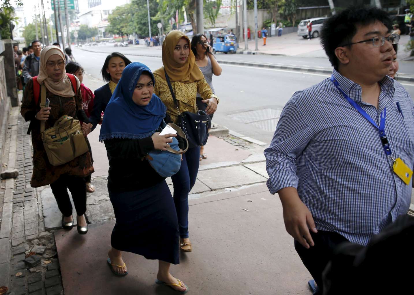 11.20am: Indonesian workers run as they are evacuated from their office at Thamrin business district in Jakarta.
