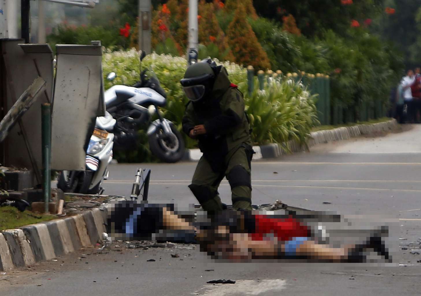 11am: A member of the Indonesian bomb squad checks two bodies after a bomb blast in front of a shopping mall in Jakarta, Indonesia on Jan 14, 2016.
