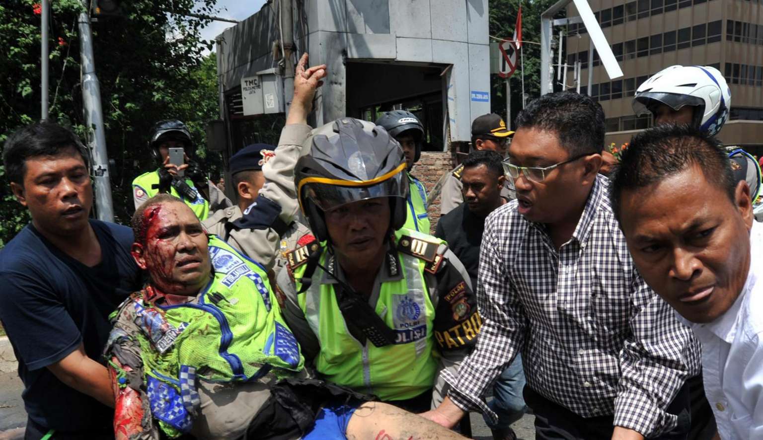 11am: An injured Indonesian policeman is evacuated from the site of a bomb blast in Jakarta on Jan 14, 2016.