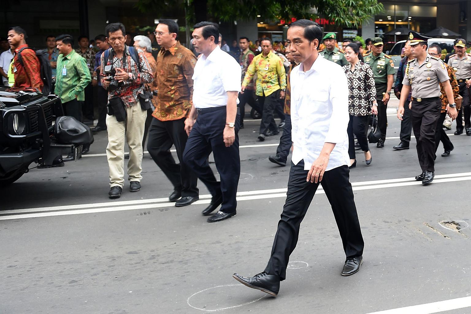 Indonesian President Joko Widodo (right, foreground) inspecting the area outside the Starbucks cafe on Jan 14, 2016.