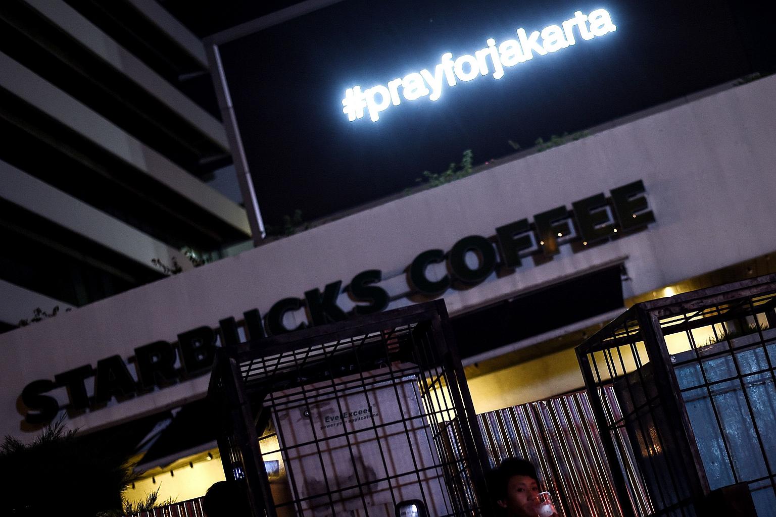 A "Pray for Jakarta" message is displayed on a screen at the damaged Starbucks cafe on Jan 14, 2016.