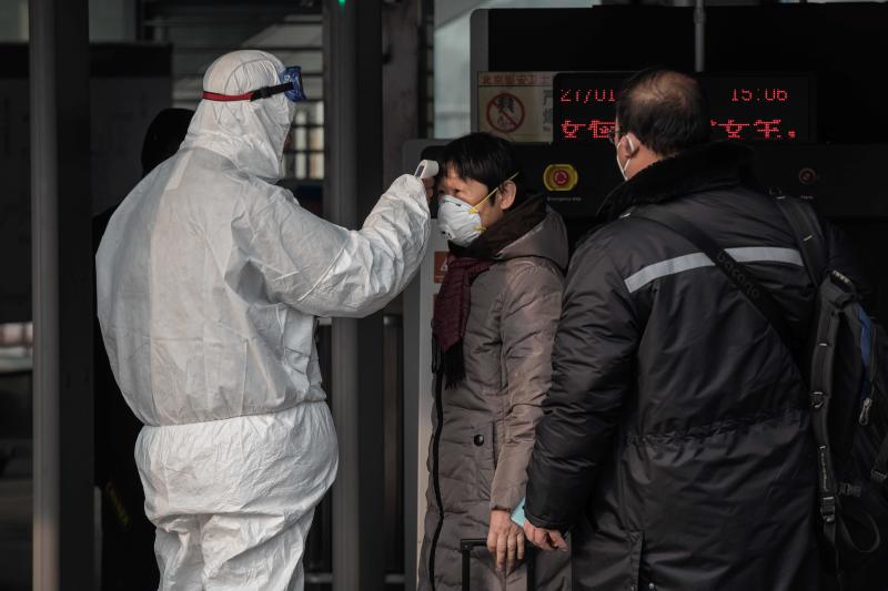 A security personnel wearing protective clothing checks the temperature of a woman at a subway station entrance in Beijing on Jan 27, 2020.