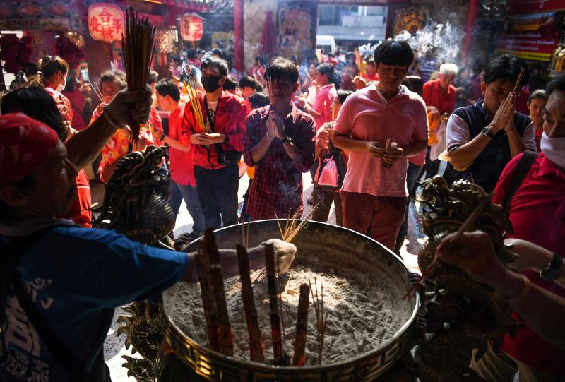 People praying in a Chinese temple during Chinese New Year celebrations in Bangkok on Feb 5, 2019.