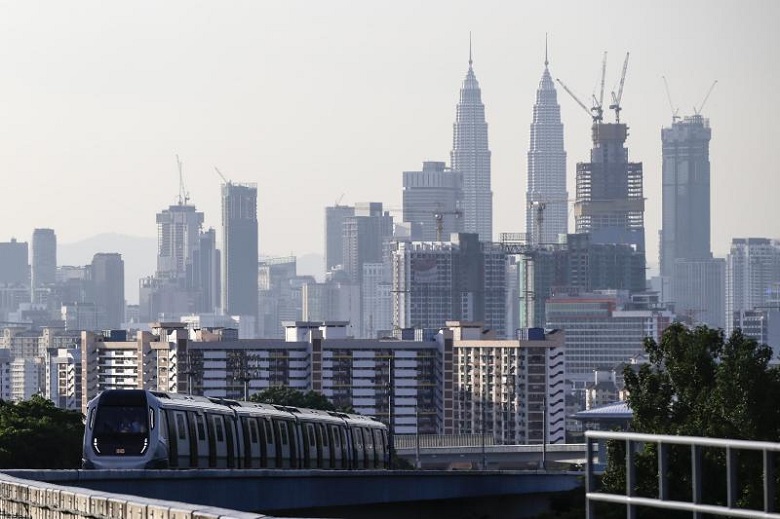 A train travels against a backdrop of the capital city of Kuala Lumpur on the second phase of the first Mass Rapid Transit (MRT) Line at Kajang, Malaysia, on July 17, 2017.