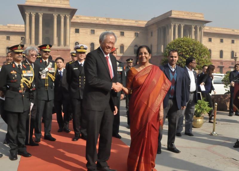 Defence Minister Ng Eng Hen is met by his Indian counterpart Nirmala Sitharaman upon his arrival at India's Ministry of Defence.