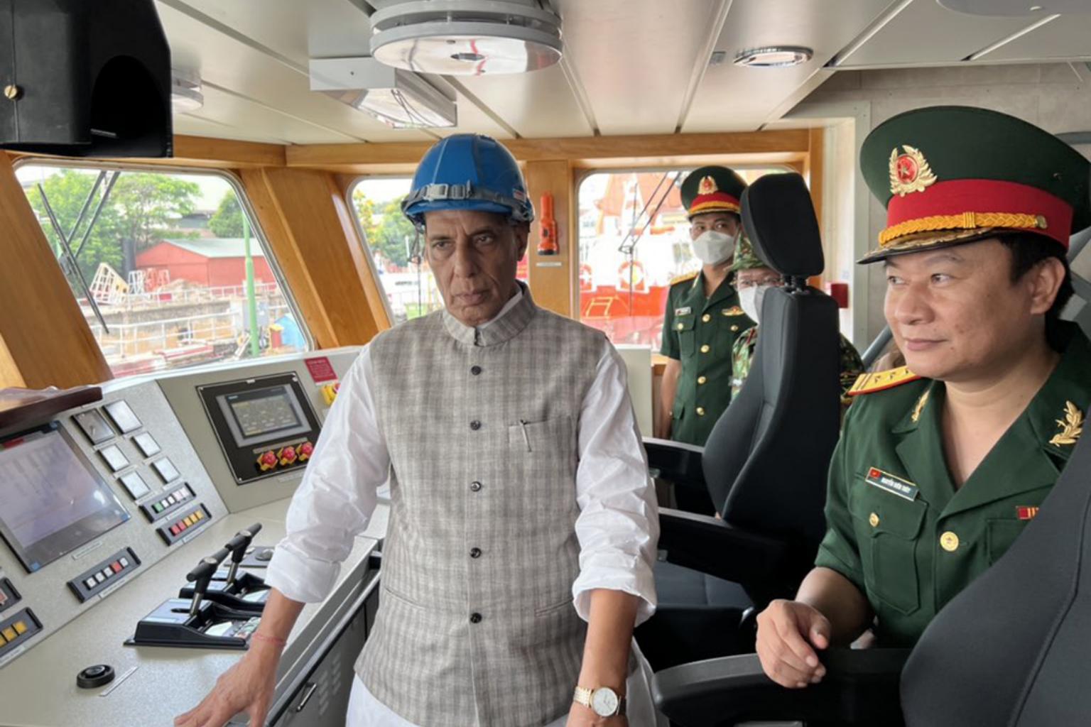 Indian Defence Minister Rajnath Singh at Hong Ha Shipyard in Vietnam to hand over 12 high-speed patrol boats.