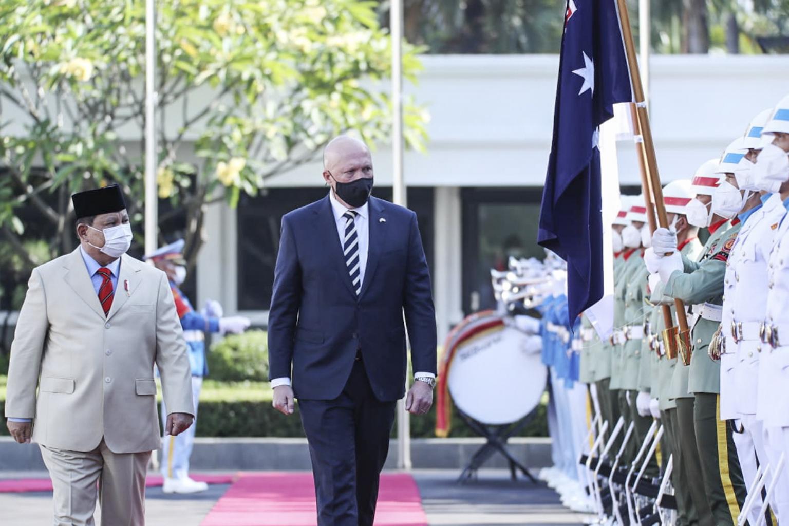 Indonesian Defence Minister Prabowo Subianto and his Australian counterpart Peter Dutton inspecting the honour guards before their meeting in Jakarta on Sept 9, 2021.