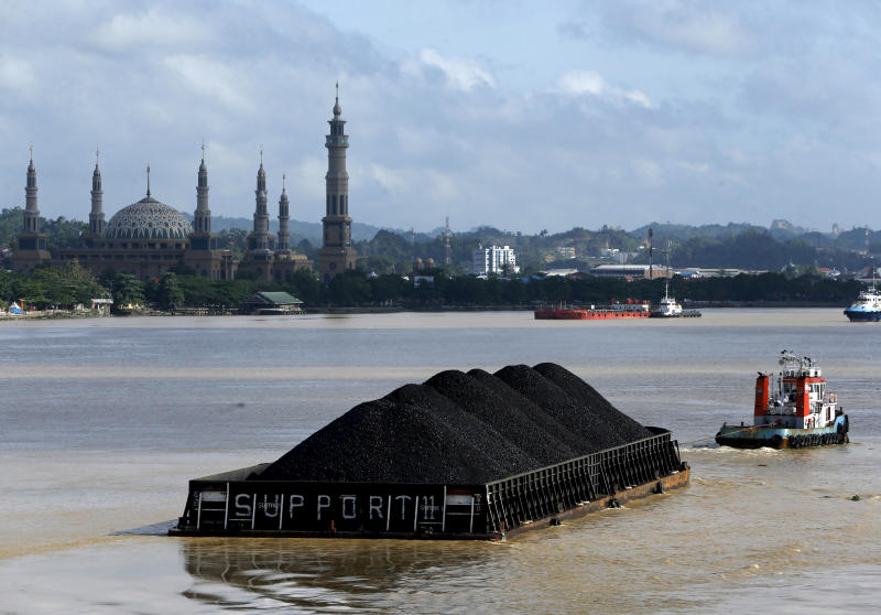 In a file photo taken on March 2, 2016, a tug boat pulls a coal barge along the Mahakam River in Samarinda, East Kalimantan province, Indonesia.