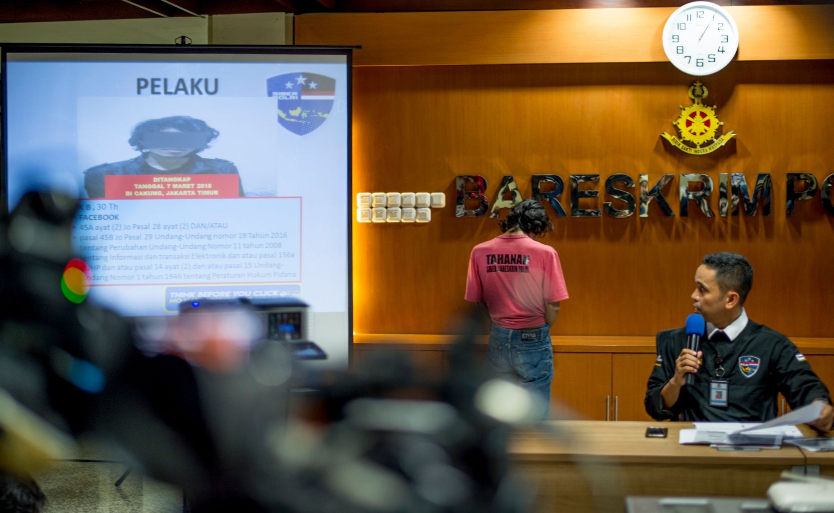 Indonesian cyber crime police displaying a suspect accused of spreading fake news and online hate speech in Jakarta on March 8, 2018.