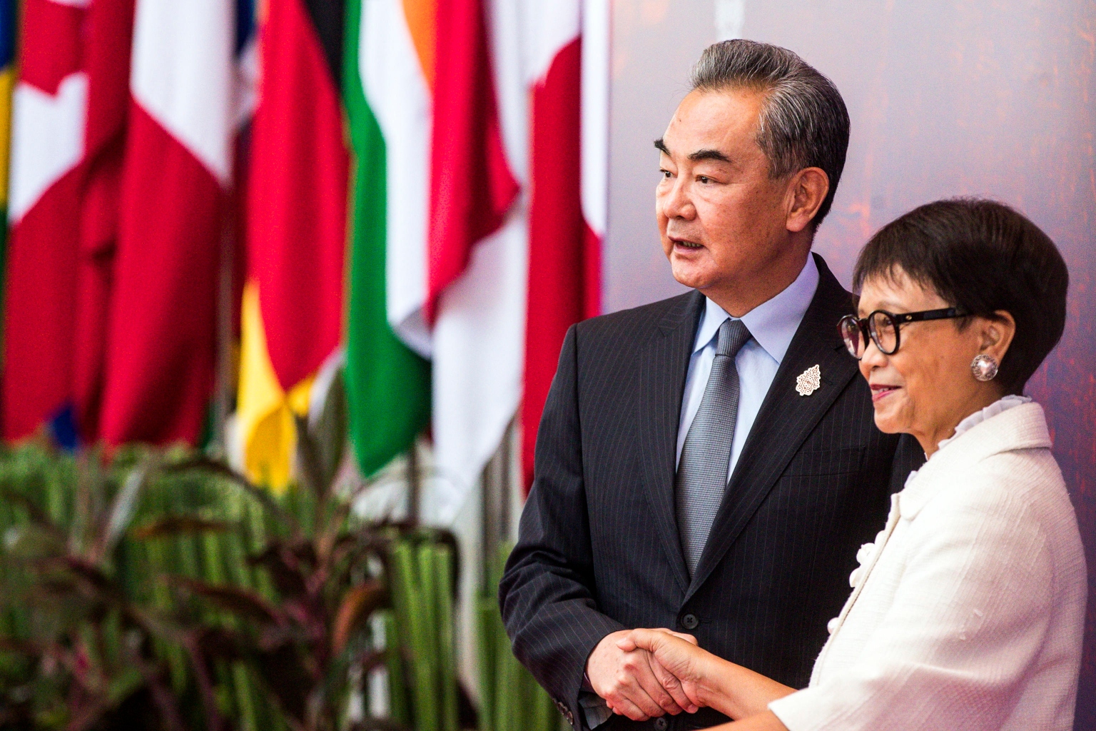Indonesian FM Retno Marsudi (right) welcomes her Chinese FM Wang Yi at the G20 Meeting in Nusa Dua, Bali, on July 8, 2022.