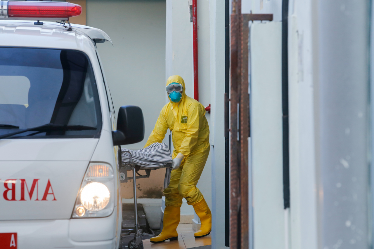 A photo taken on March 11, 2020, shows a medical worker pulling a stretcher from an ambulance to the isolation room for Covid-19 patients at Sanglah Hospital in Denpasar, Bali, Indonesia.