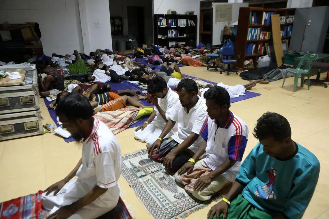 Rohingya refugees holding a morning prayer in a temporary shelter at an old Indonesian Red Cross building in Meulaboh, West Aceh, after being rescued at sea.