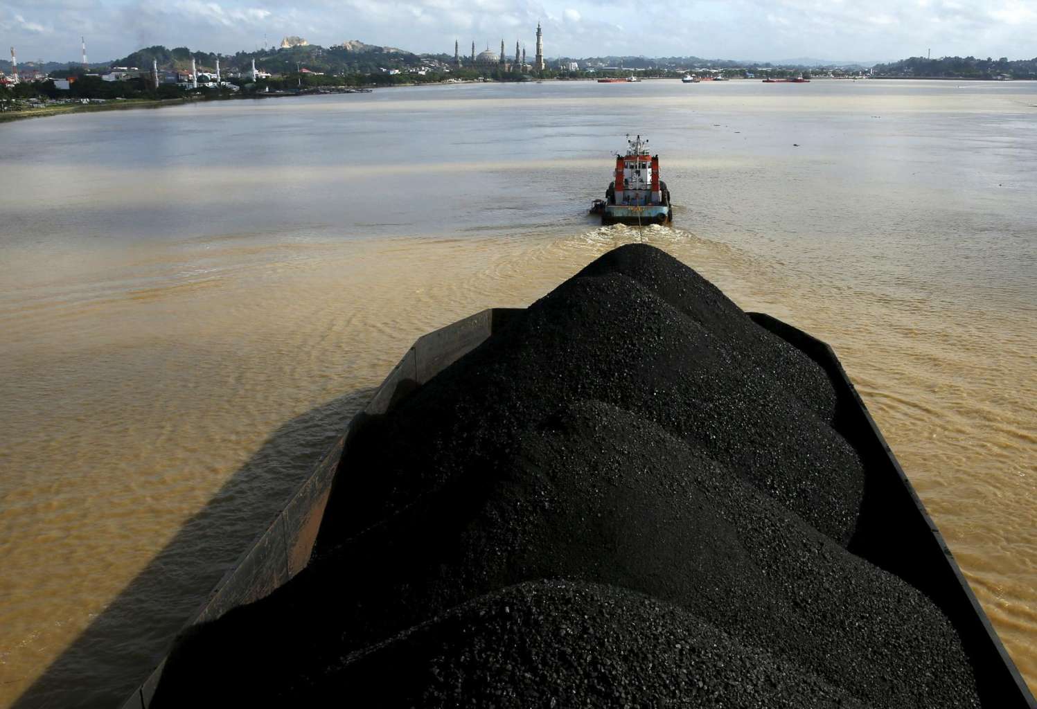 A tug boat pulls a coal barge along the Mahakam River in Samarinda, Indonesia.
