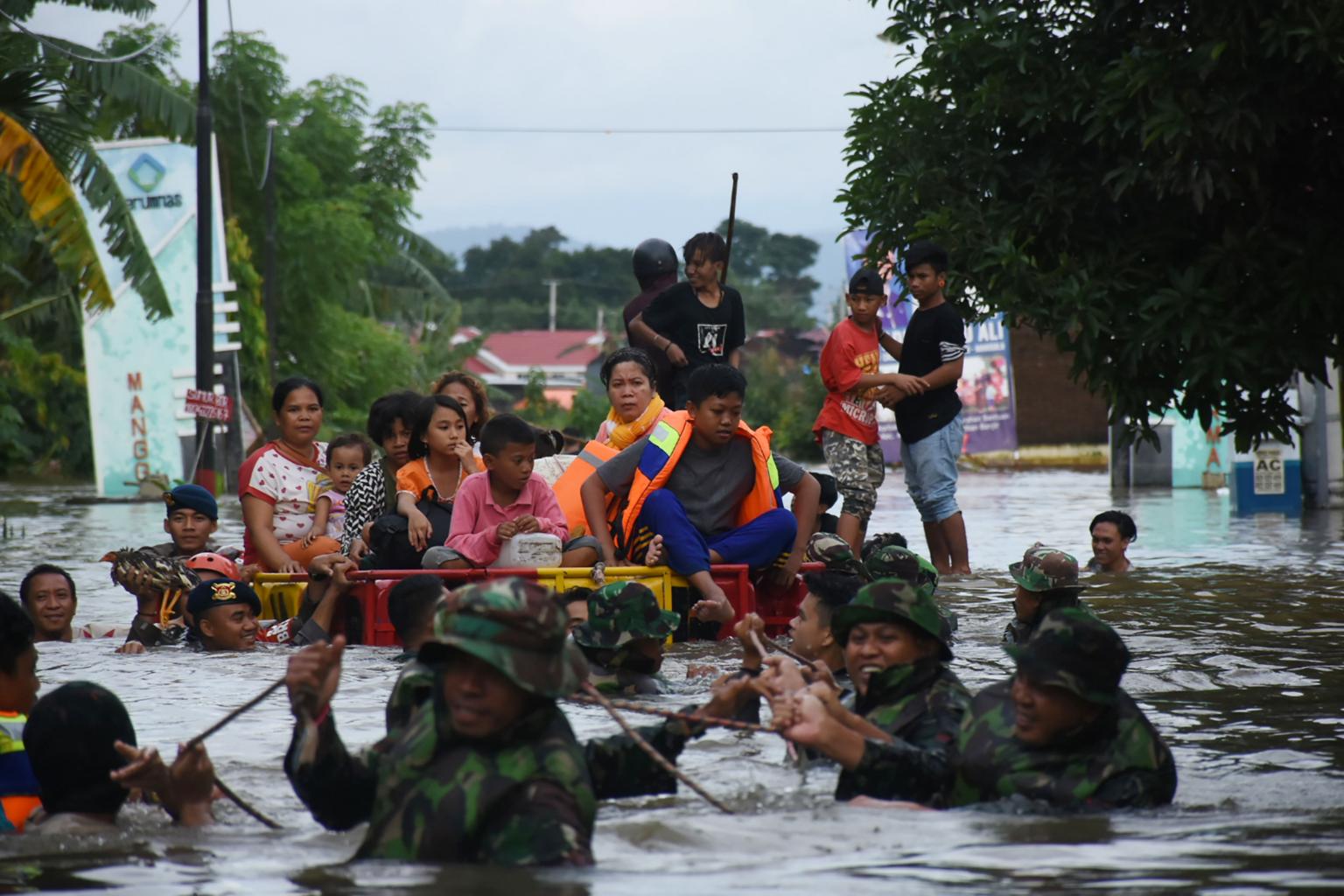 Indonesian soldiers evacuate flood-affected residents in Makassar, on Jan 23, 2019.