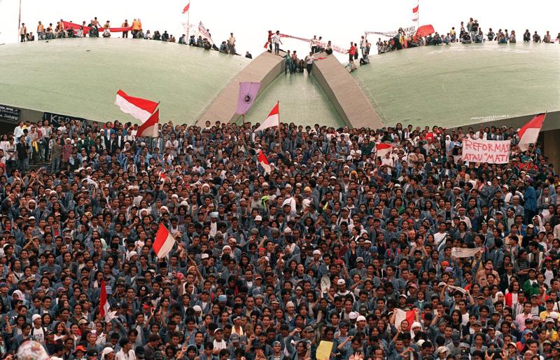 A file photo taken on May 20, 1998, shows Indonesian students gathering in front and on top of the Split Dome of the Assembly Hall of Parliament in Jakarta.
