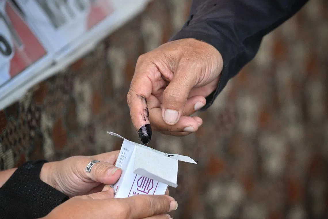 A voter dipping his finger into ink to indicate that he has voted at a polling station in Lebak Bulus, South Jakarta, on Feb 14.