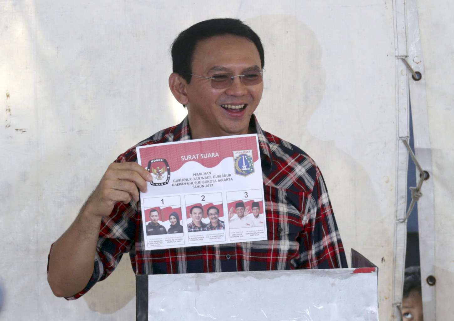 Basuki 'Ahok' Tjahaja Purnama, the current governor of Jakarta up for re-election, shows his ballot paper before putting it in a ballot box during regional elections in Jakarta, Indonesia, on Feb 15, 2017.