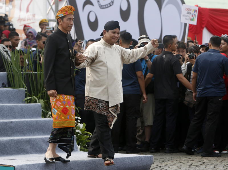 Both leaders - dressed in traditional Indonesian folk costumes - attended an official campaign launch in central Jakarta on Sunday morning, in which they pledged to run a peaceful contest free from hoaxes and the politicisation of ethnicity and religion.