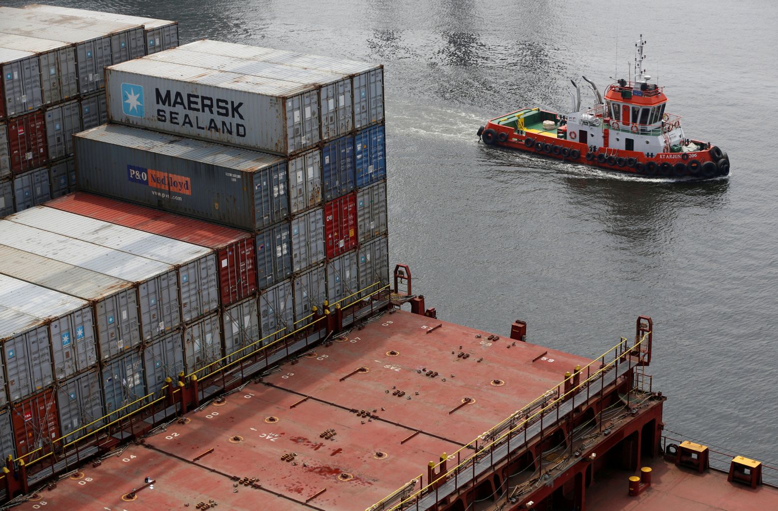 A tugboat sails past a container ship in Tanjung Priok Port, Jakarta, Indonesia.