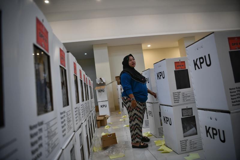 An Indonesian election commission worker at the storage area where ballot boxes and voting materials are prepared, in Pademangan on April 11, 2019.