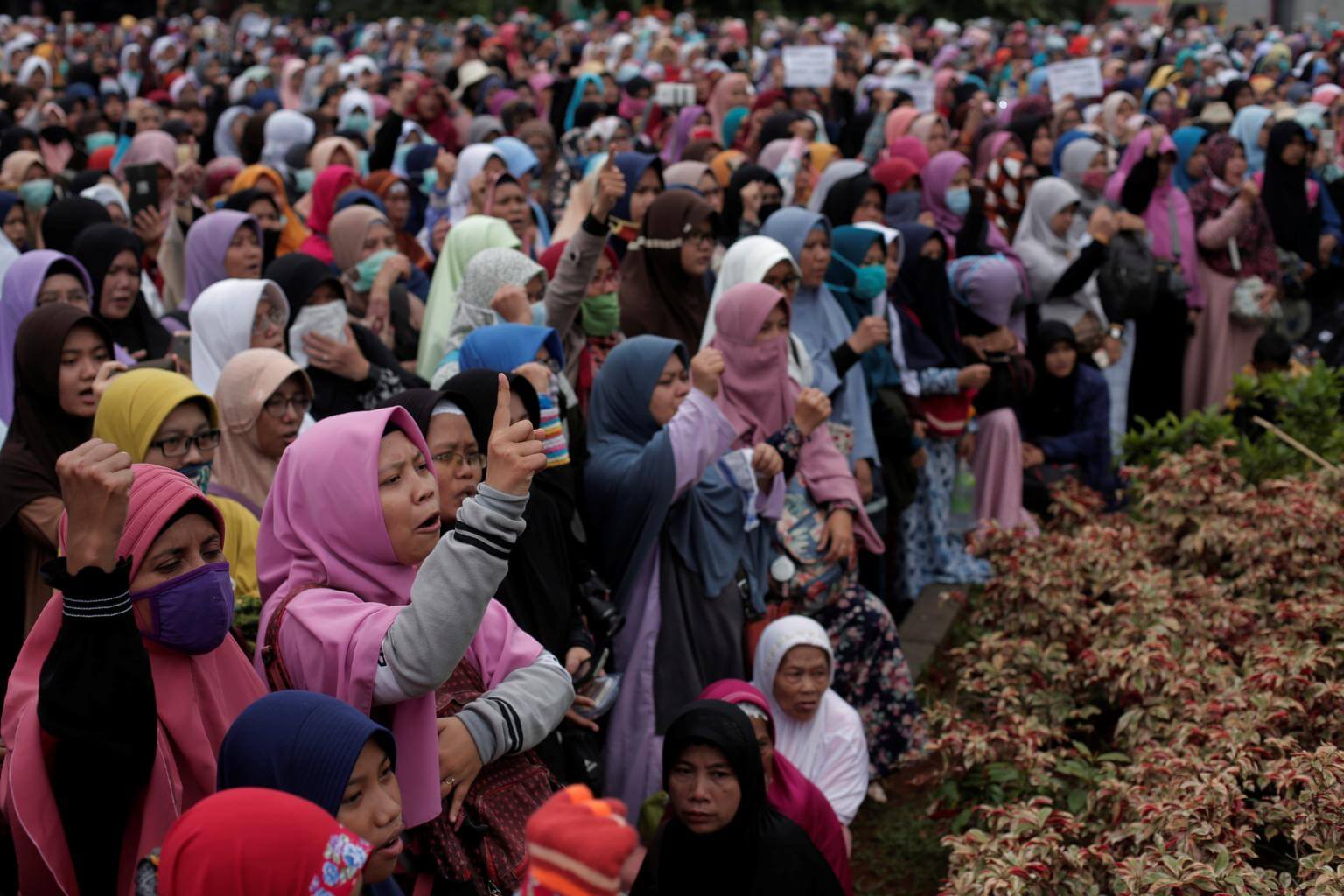 Women shout slogans during a protest against Indonesian President Joko Widodo's decree to disband Islamist groups in Jakarta, on July 18, 2017.