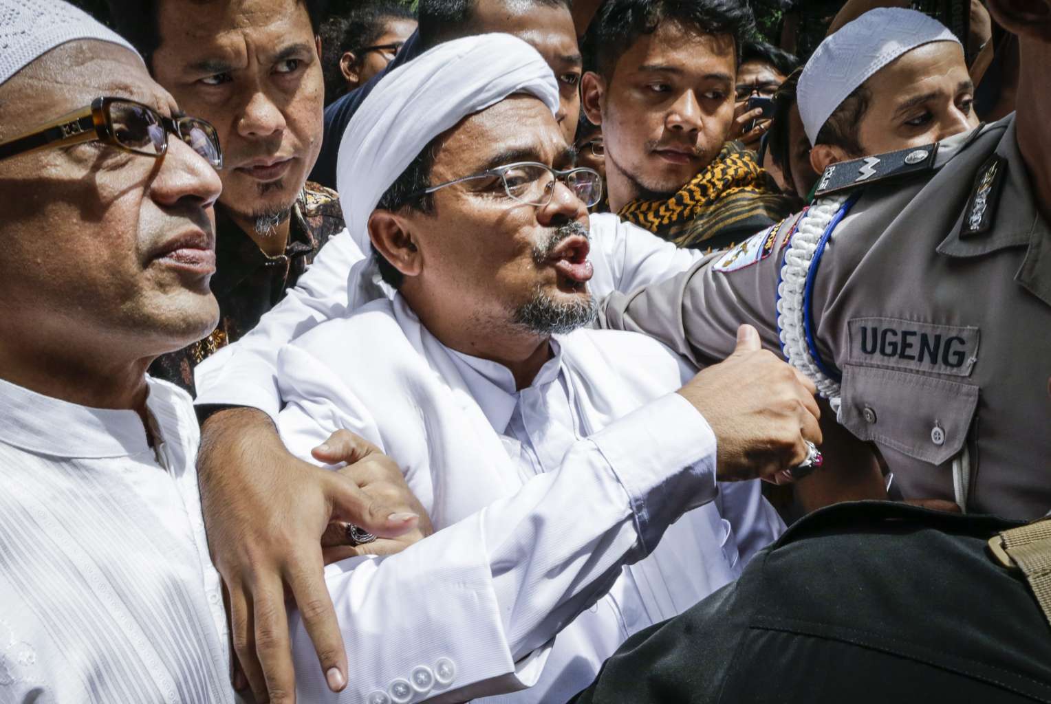 Indonesian cleric Habib Rizieq Shihab speaking while being escorted by police officers and supporters at the police headquarters in Jakarta on Jan 23, 2017.