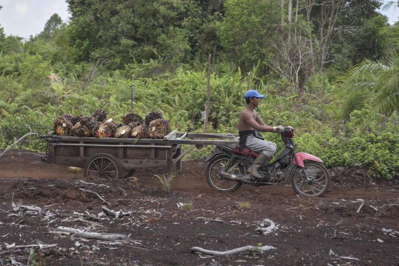 A farmer transports the fruits of oil palm plants grown on peatland in Riau, Indonesia.