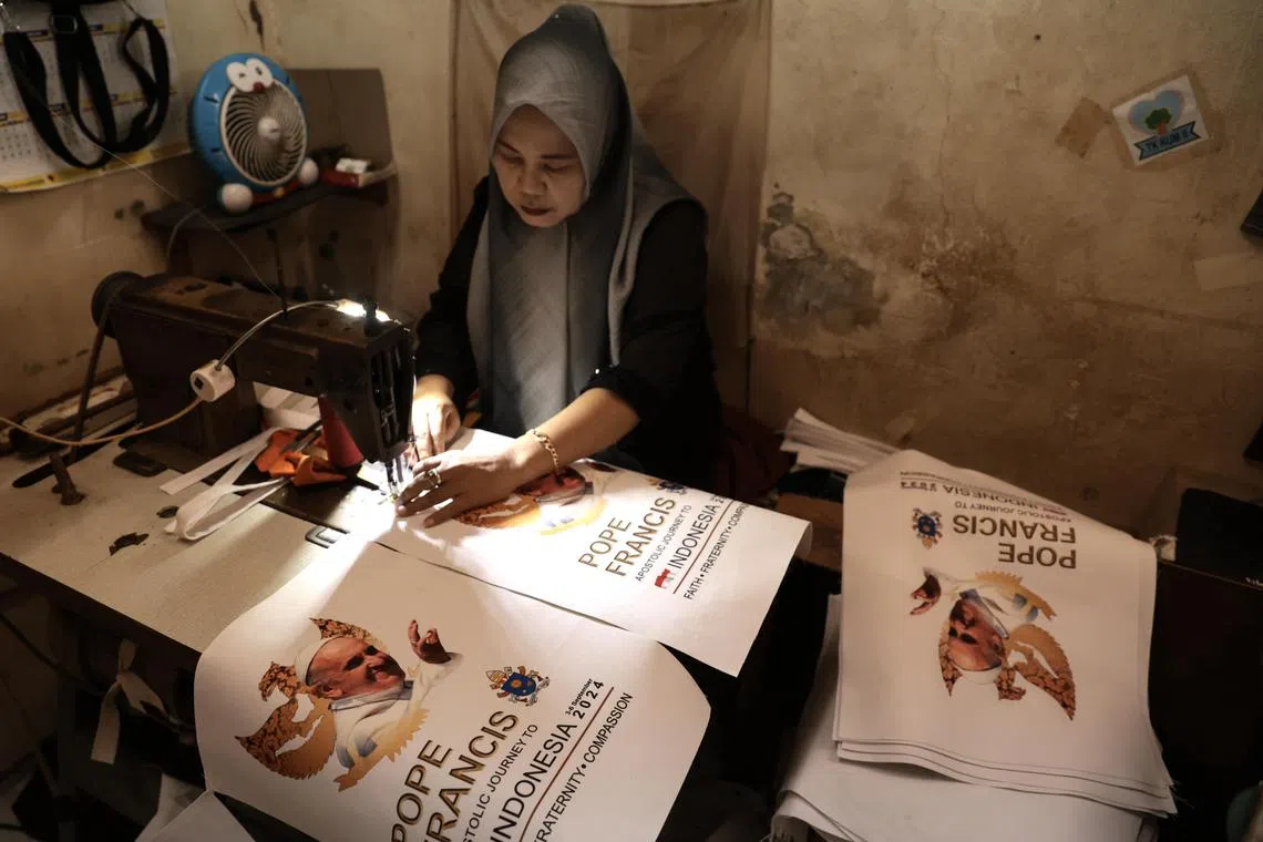 A Muslim worker sewing tote bags with Pope Francis’ image at a workshop in Tangerang, Indonesia, on Aug 28.