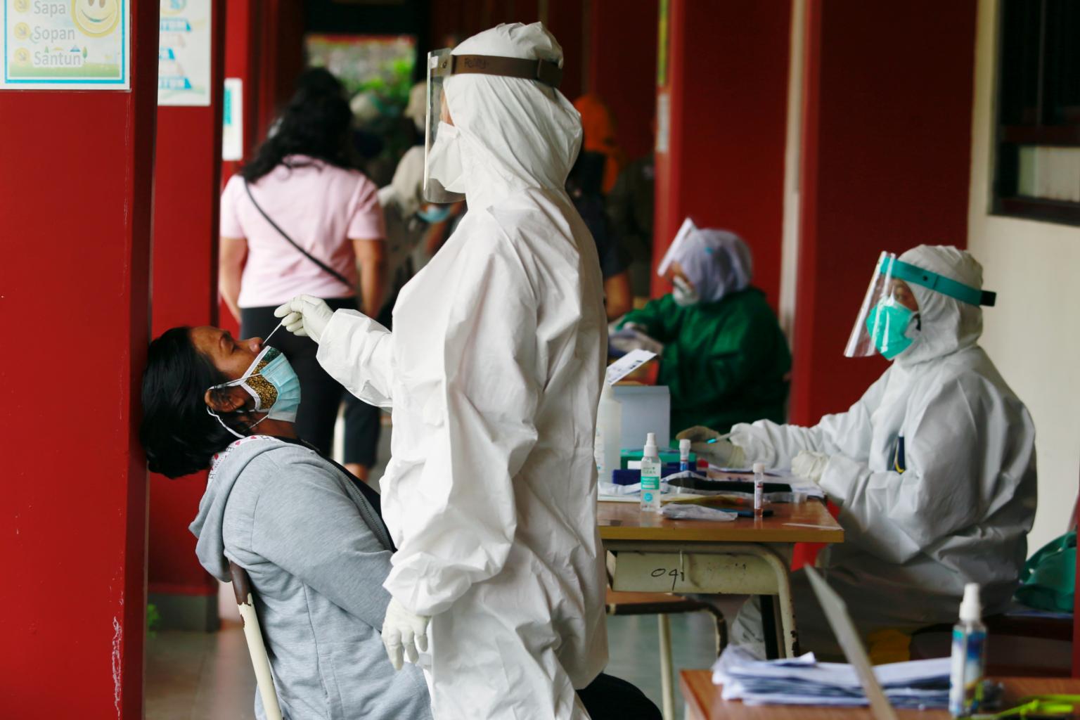 A healthcare worker taking a swab sample during mass testing at a school in Jakarta, Indonesia, on July 2, 2021.