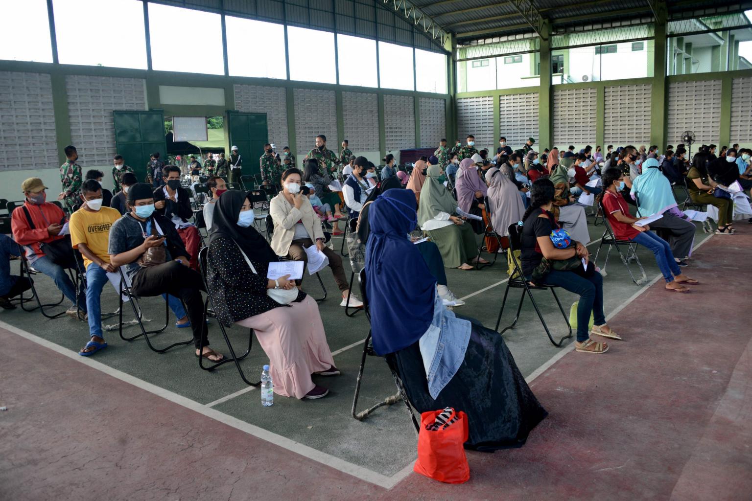People waiting to receive their Covid-19 vaccine shots in Denpasar on Aug 4, 2021.