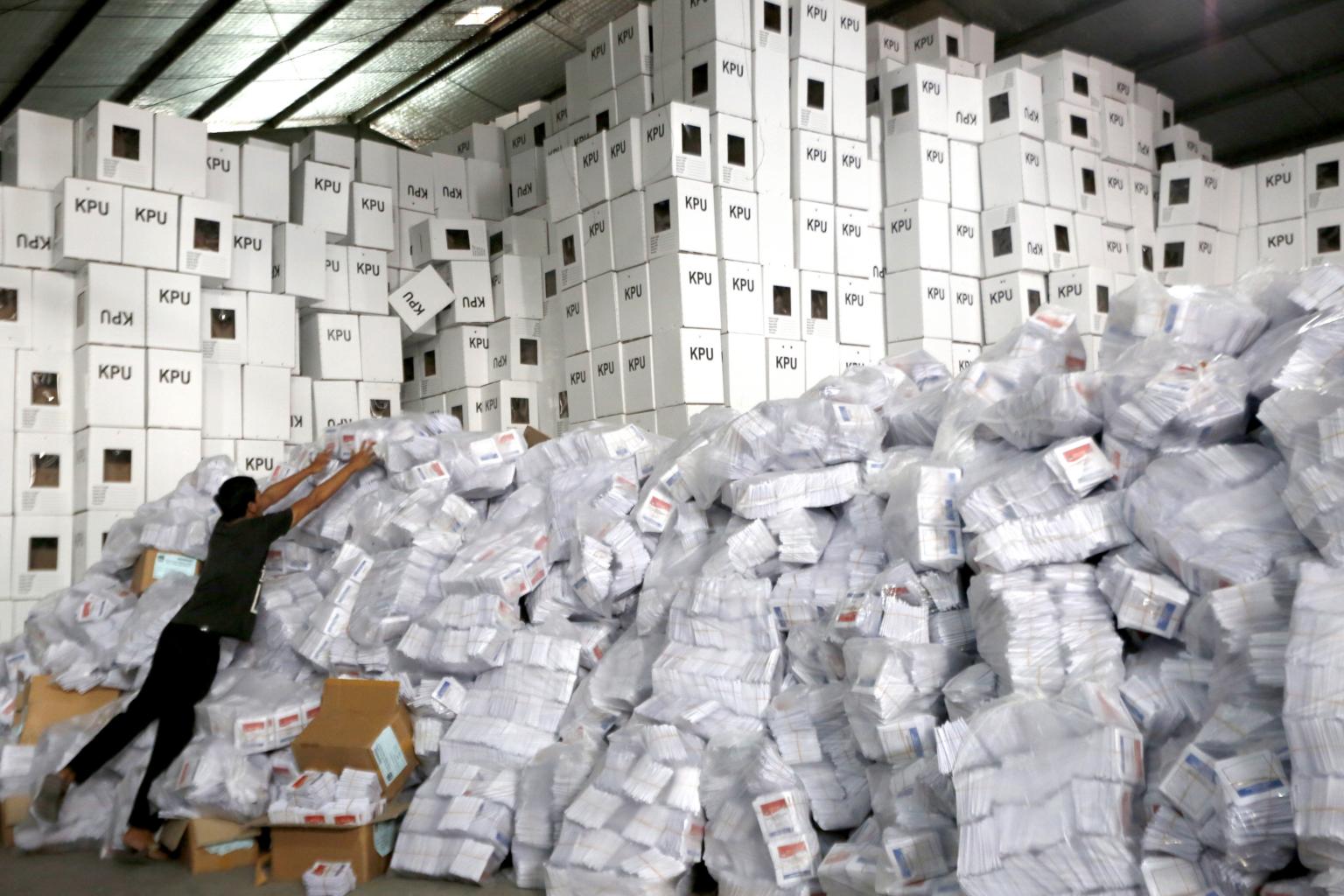 A worker sorts ballot papers for the upcoming general elections at a warehouse in Bogor, Indonesia, on Feb 27, 2019.