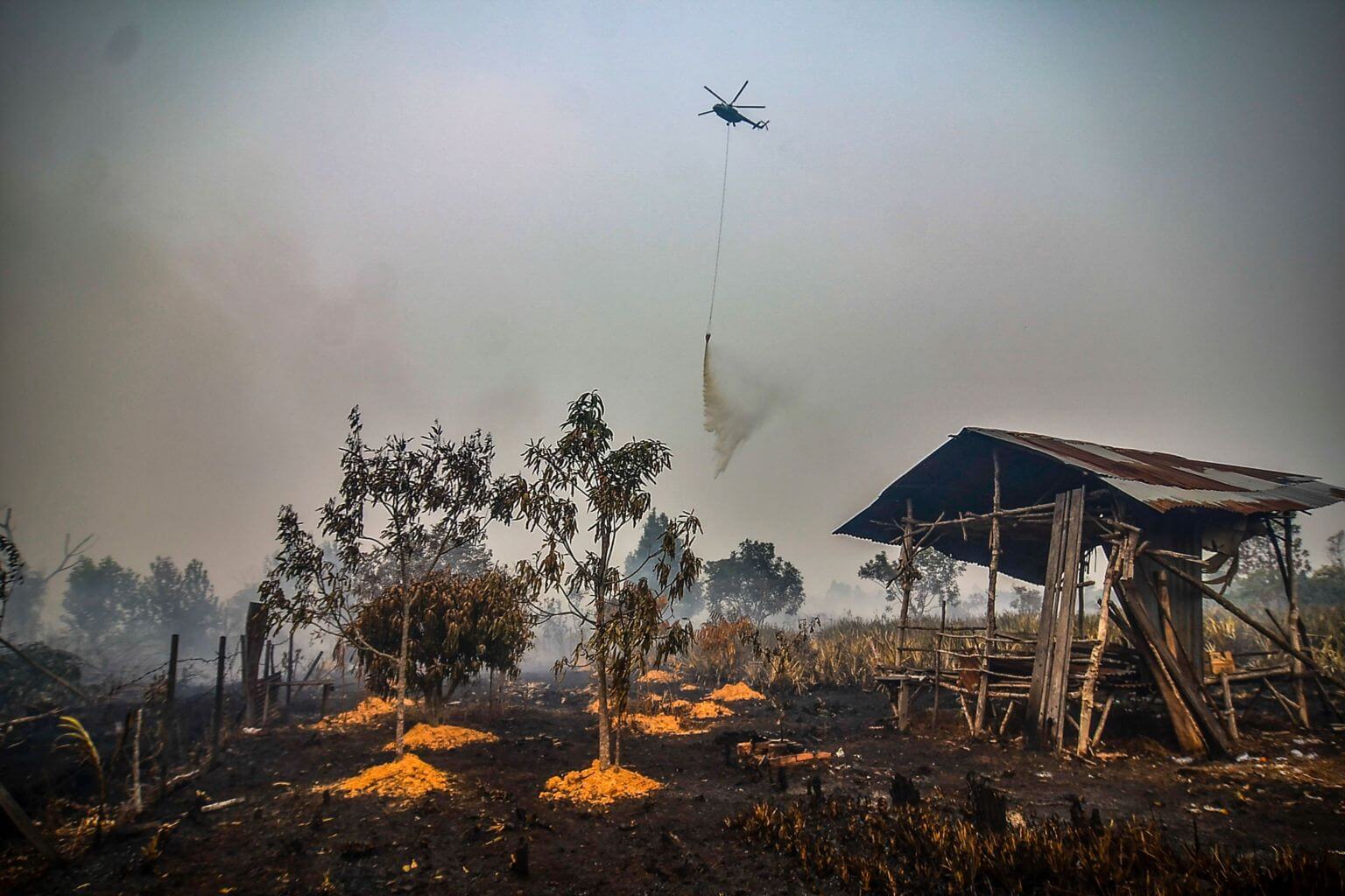 A water-bombing helicopter douses the burning peatland in Kampar of Riau province, on Sept 18, 2019.