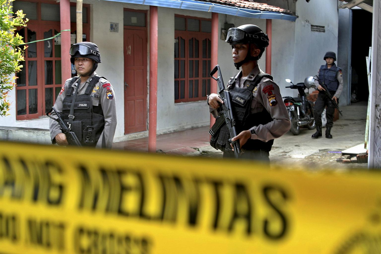 Armed Indonesian police standing guard in front of a house during a raid.