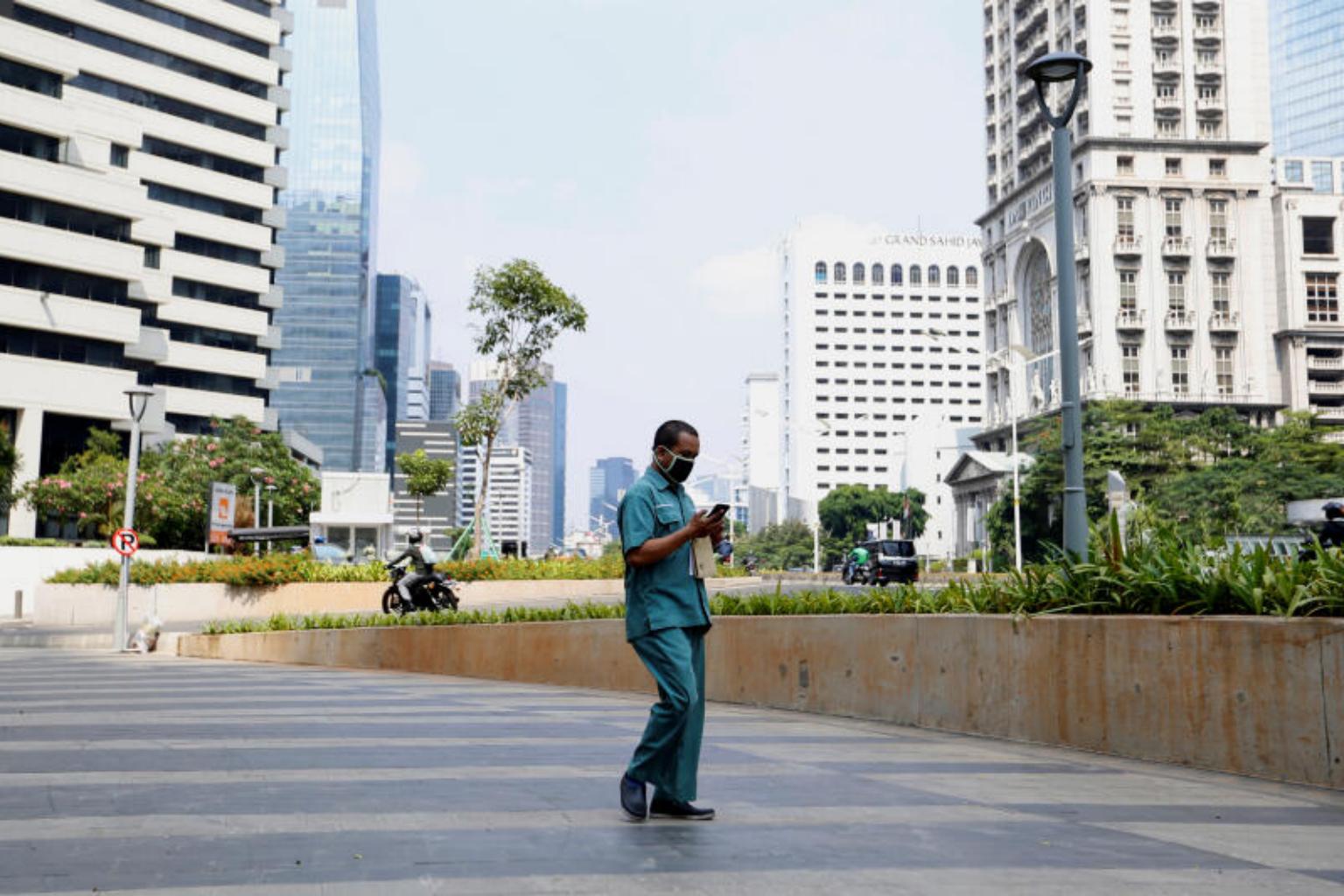 A man walking in a business district in Jakarta as the Indonesian government eases restrictions amid the coronavirus outbreak, on June 8, 2020.