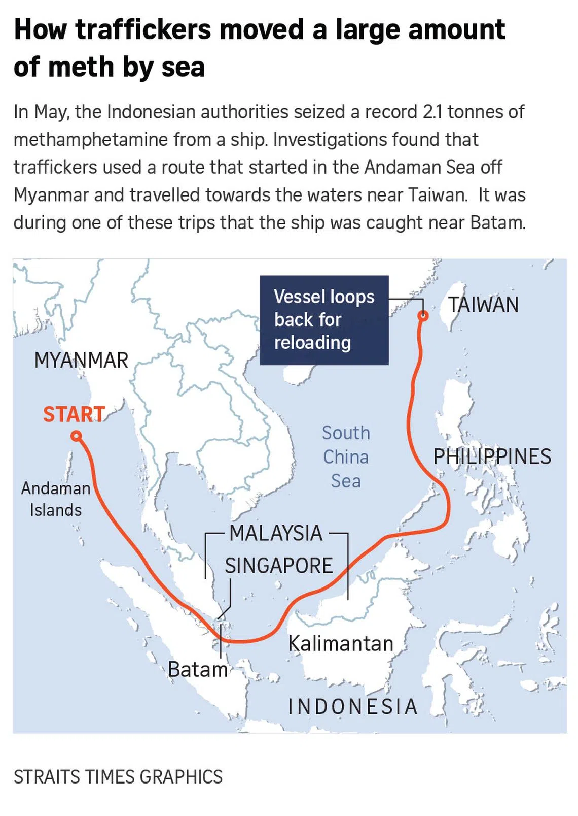 - Indonesia seized a record 2.1 tonnes of methamphetamine from a ship in May, revealing a maritime drug route from Myanmar through South-east Asia.