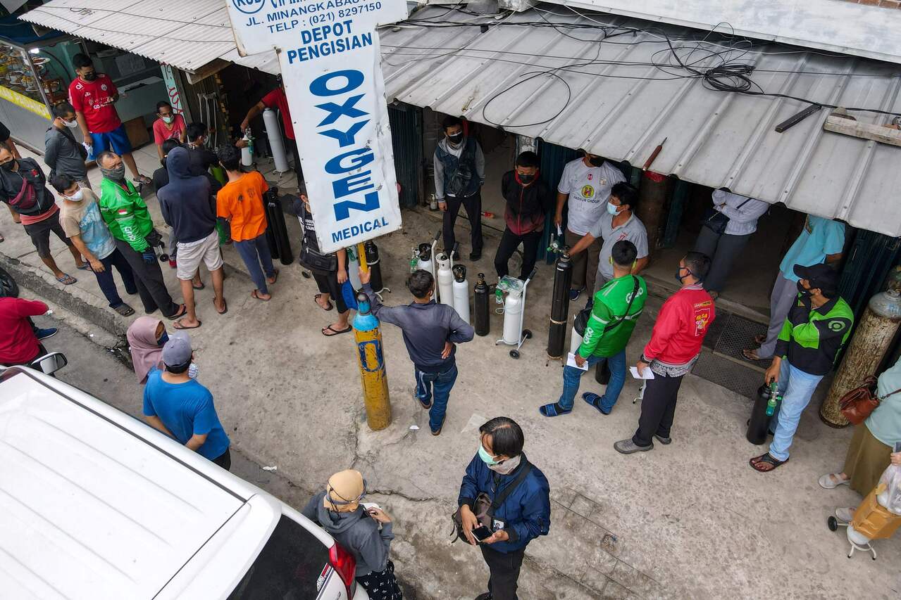 Indonesians queueing at an oxygen filing shop to fill tanks for sick family members in Jakarta, on June 30, 2021.