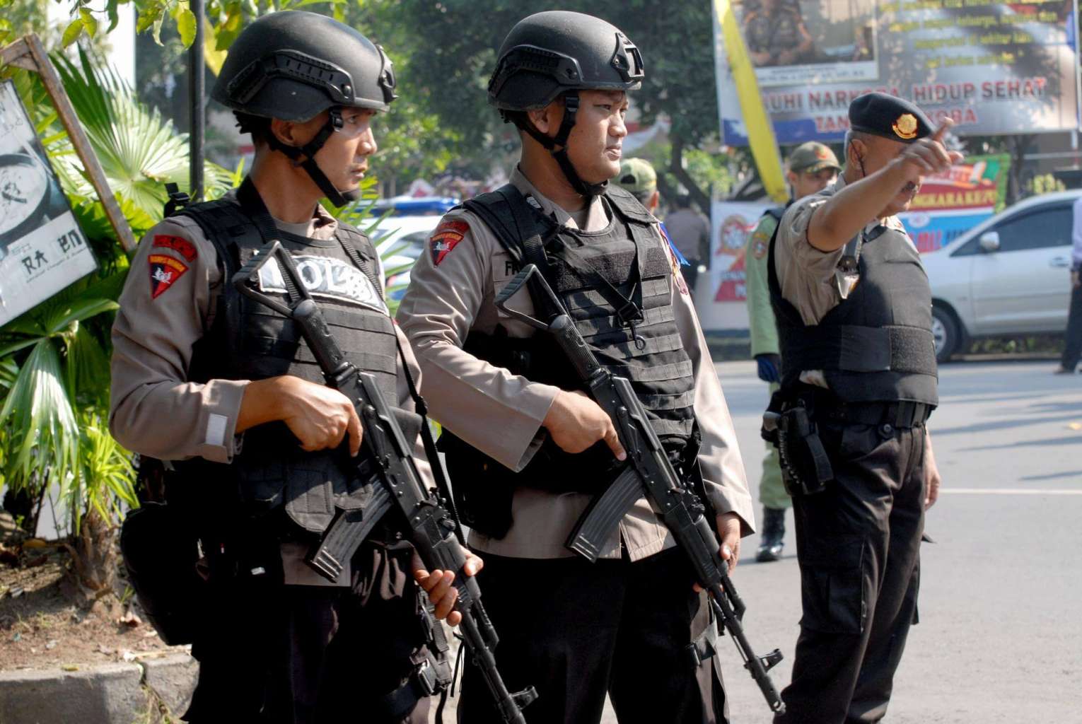 Indonesian police stand guard outside a police station in the Indonesian city of Solo on July 5.