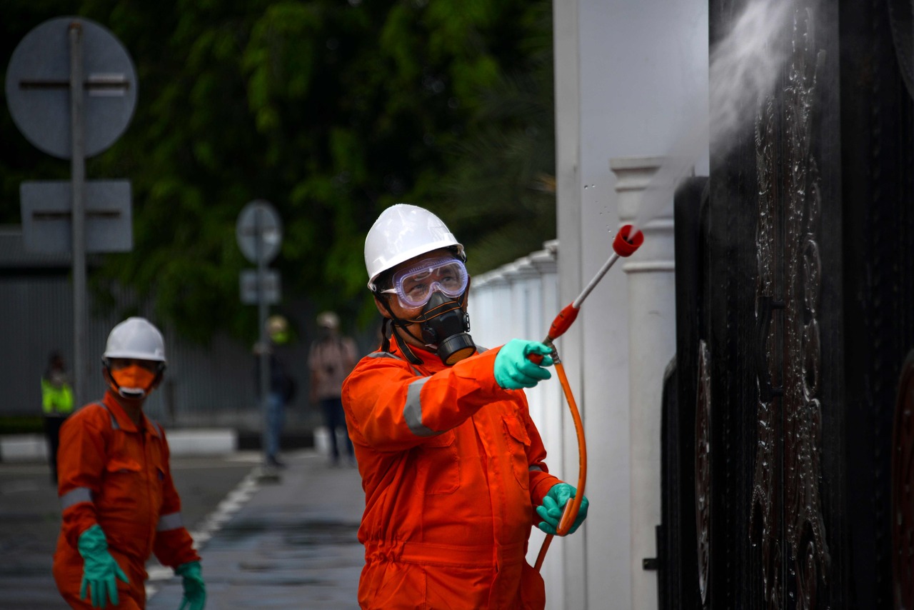 Indonesian government workers wearing protective gear disinfectant a street in Banda Aceh on April 18, 2020.