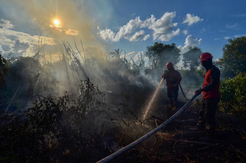 Firefighters extinguishing a peatland fire in Karya Indah village in Indonesia's Riau province on April 3, 2019.