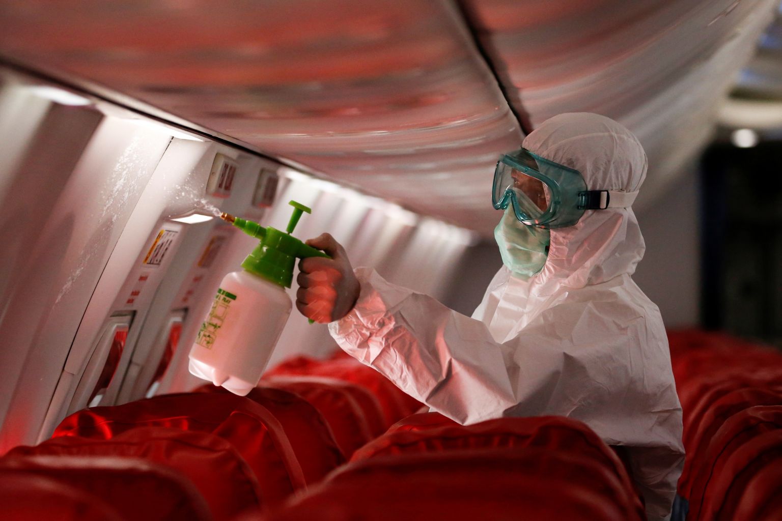 A cleaning worker sprays disinfectant inside the cabin of a Lion Air Boeing 737-800 at Soekarno-Hatta International Airport near Jakarta, Indonesia, March 17, 2020.