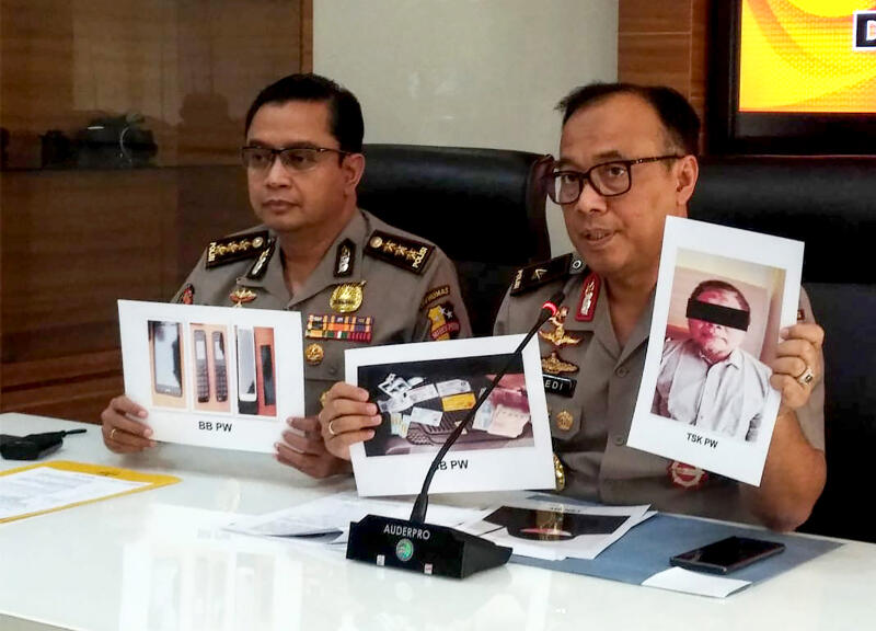 Indonesian police personnel show photographs of leader Para Wijayanto and various seized items in Jakarta on July 1, 2019.