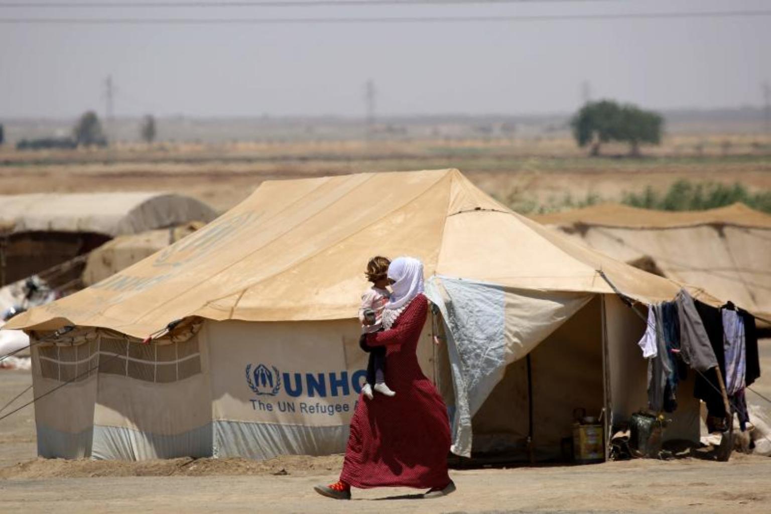 A Syrian woman displaced from Raqqa walks carrying a child at the al-Karamah camp, on June 13, 2017.