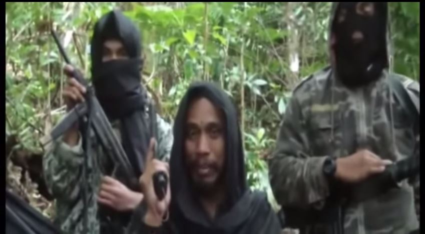 Wanted Indonesian fugitive Santoso (centre) speaking in a YouTube video.