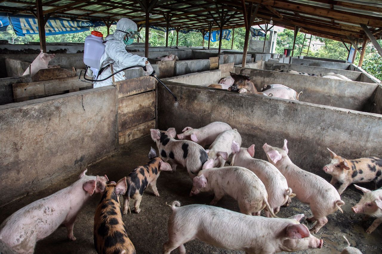 A worker spraying pigs in Kabanjahe, Karo, North Sumatra, on Nov 12, 2019. African swine fever has killed more than 43,000 pigs in Indonesia's North Sumatra province